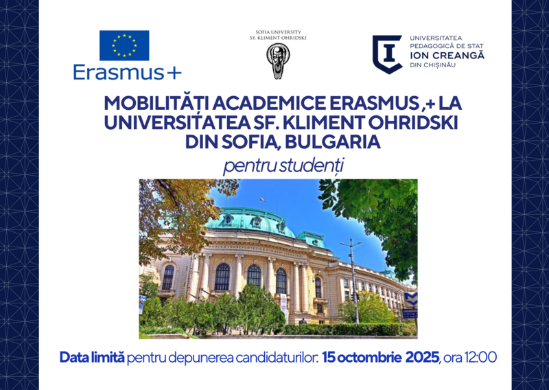 Secția Relații Internaționale și Managementul Proiectelor a #UPSC anunță concursul de depunere a dosarelor de candidatură pentru 2 burse de studii pentru studenții înscriși la programele de studii Geografie (ciclul Licență, zi, începând cu anul II de studii) la Universitatea Sf. Kliment Ohridski din Sofia, Bulgaria pentru semestrul II al anului academic 2025 – 2026.