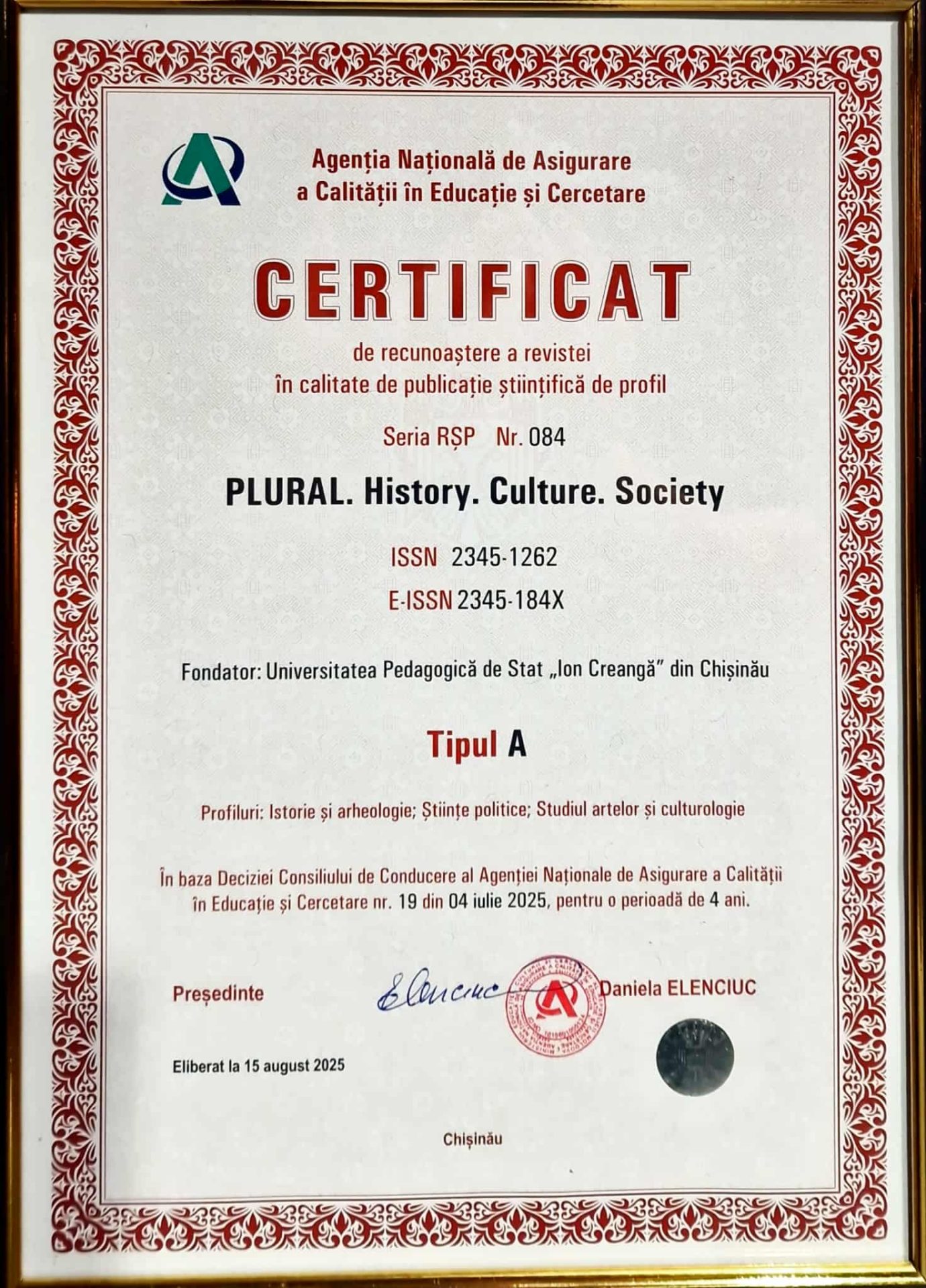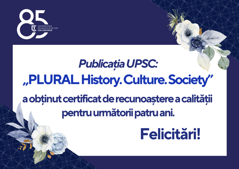 Publicația UPSC „PLURAL. History. Culture. Society”: urmare a evaluării de către ANACEC, a obținut certificat de recunoaștere a revistei în calitate de publicație științifică de profil.