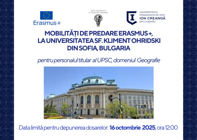 Secția Relații Internaționale și Managementul Proiectelor a UPSCanunță concurs de depunere a dosarelor de candidatură pentru 2 burse de predare pentru personalul titular în semestrul II al anului academic 2025-2026 laUniversitatea Sf. Kliment Ohridski .