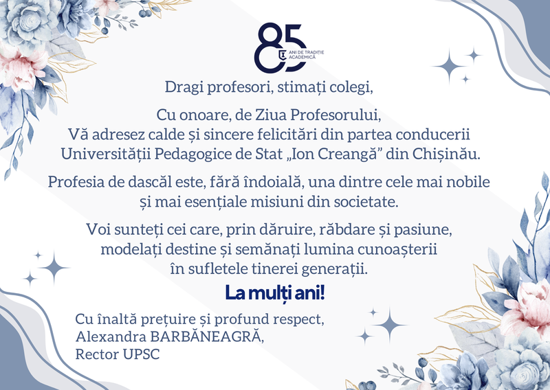 Cu onoare, de Ziua Profesorului, Vă adresez calde și sincere felicitări din partea conducerii Universității Pedagogice de Stat „Ion Creangă” din Chișinău.