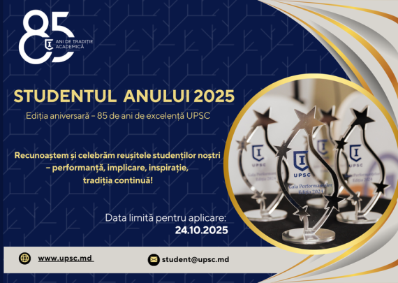 Concursul „Studentul Anului” – Ediția 2025 Ediție aniversară – 85 de ani de excelență UPSC Universitatea Pedagogică de Stat „Ion Creangă” din Chișinău anunță lansarea Concursului „Studentul Anului” – Ediția 2025, un eveniment dedicat recunoașterii excelenței academice, implicării civice și realizărilor studenților și masteranzilor universității. Această ediție are o semnificație specială, […]