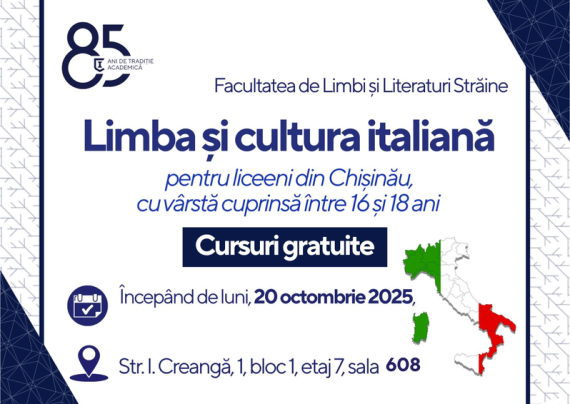 Cursul de Limbă și Cultură Italiană la Facultatea de Limbi și Literaturi Străine Facultatea de Limbi și Literaturi Străine, Universitatea Pedagogică de Stat „Ion Creangă”, organizează Cursul de Limbă și Cultură Italiană, deschis tuturor celor pasionați de limba și civilizația italiană. Cursurile au început luni, 20 octombrie 2025, și sunt coordonate de Lorella Frankarli, […]