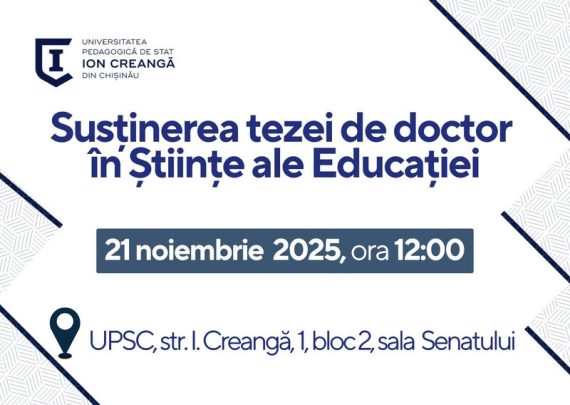Candidat: VIERU Niculai Conducător științific: GAGIM Ion, dr. hab., prof. univ. Tema tezei: DEZVOLTAREA SENSIBILITĂŢII EMOŢIONALE LA ELEVI ÎN RAPORT CU SPIRITUL MUZICII POPULARE Specialitatea: 531.01 Teoria generală a educației Data: 21.11.2025 Ora: 12.00 Locul: Universitatea Pedagogică de Stat „Ion Creangă” din Chișinău, blocul de studii nr. 2, Sala Senatului. Componența […]