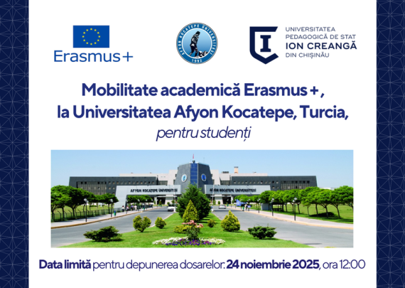 Secția Relații Internaționale și Managementul Proiectelor a #UPSCanunță depunerea dosarelor de candidatură pentru 1 bursă de studii (5 luni) pentru studenții din ciclul Licență (studenții anului I si ai anilor terminali nu sunt eligibili) la Universitatea Afyon Kocatepe, Turcia pentru semestrul II al anului academic 2025-2026 (februarie-iunie, 2026). Dosarele vor […]