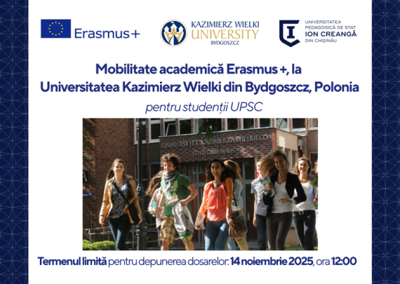 Secția Relații Internaționale și Managementul Proiectelor a #UPSCanunță depunerea dosarelor de candidatură pentru 1 bursă de studii (5 luni) pentru studenții din ciclurile Licență (studenții anului I si ai anilor terminali nu sunt eligibili) și Masteratla Universitatea Kazimierz Wielki din Bydgoszcz, Polonia pentru semestrul II al anului academic 2025-2026. Dosarele […]