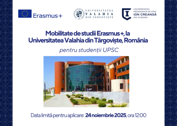 Secția Relații Internaționale și Managementul Proiectelor a UPSCanunță depunerea dosarelor de candidatură pentru 2 burse de studii (4 luni, pentru semestrul II al anului academic 2025-2026) pentru studenții din ciclurile Licență și Master (studenții anului I de la ciclul Licență și studenții înscriși la programele cu frecvență redusă Licență și […]
