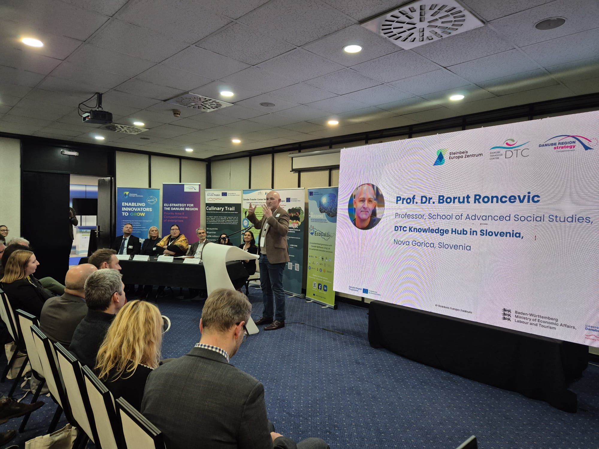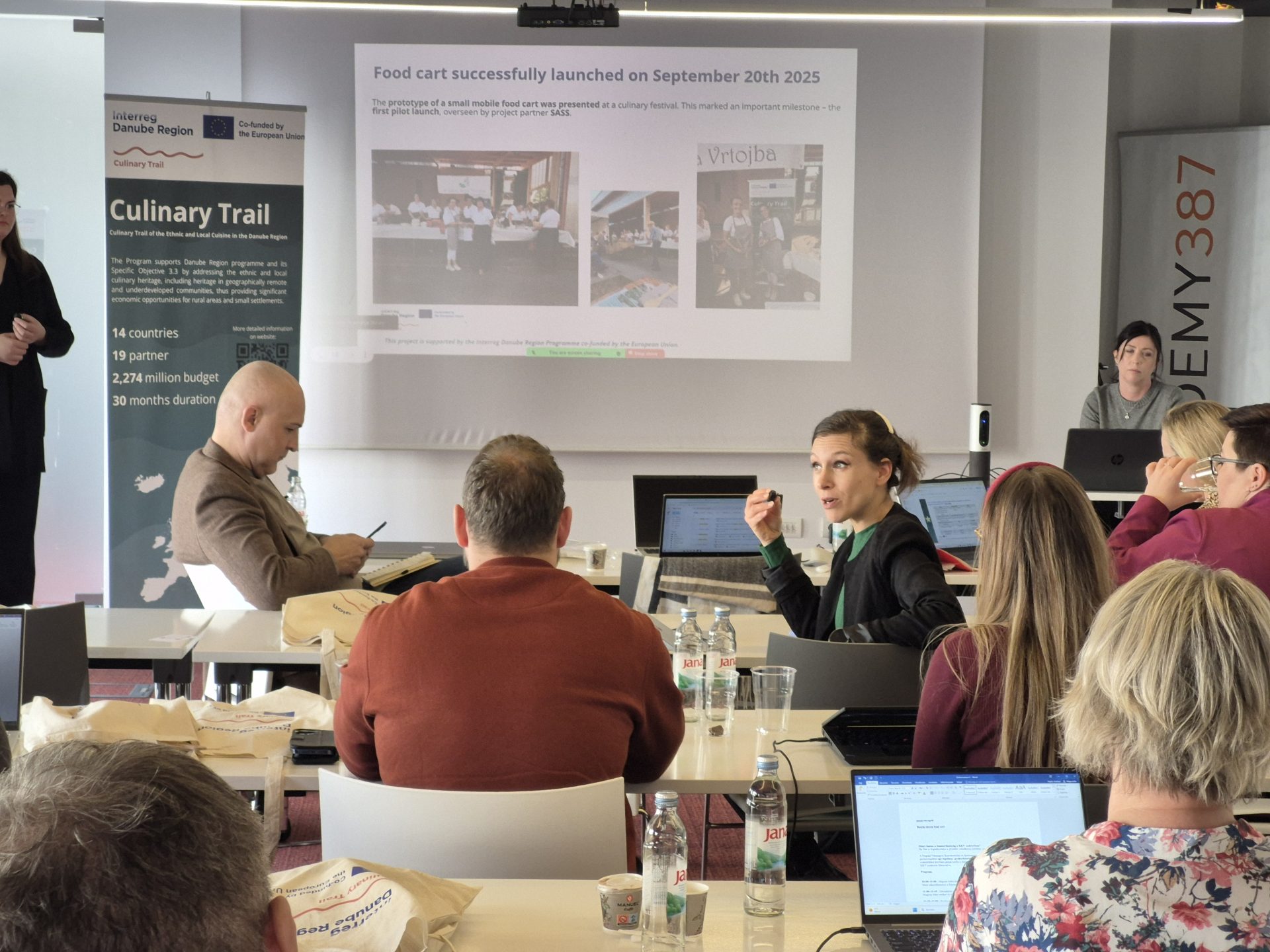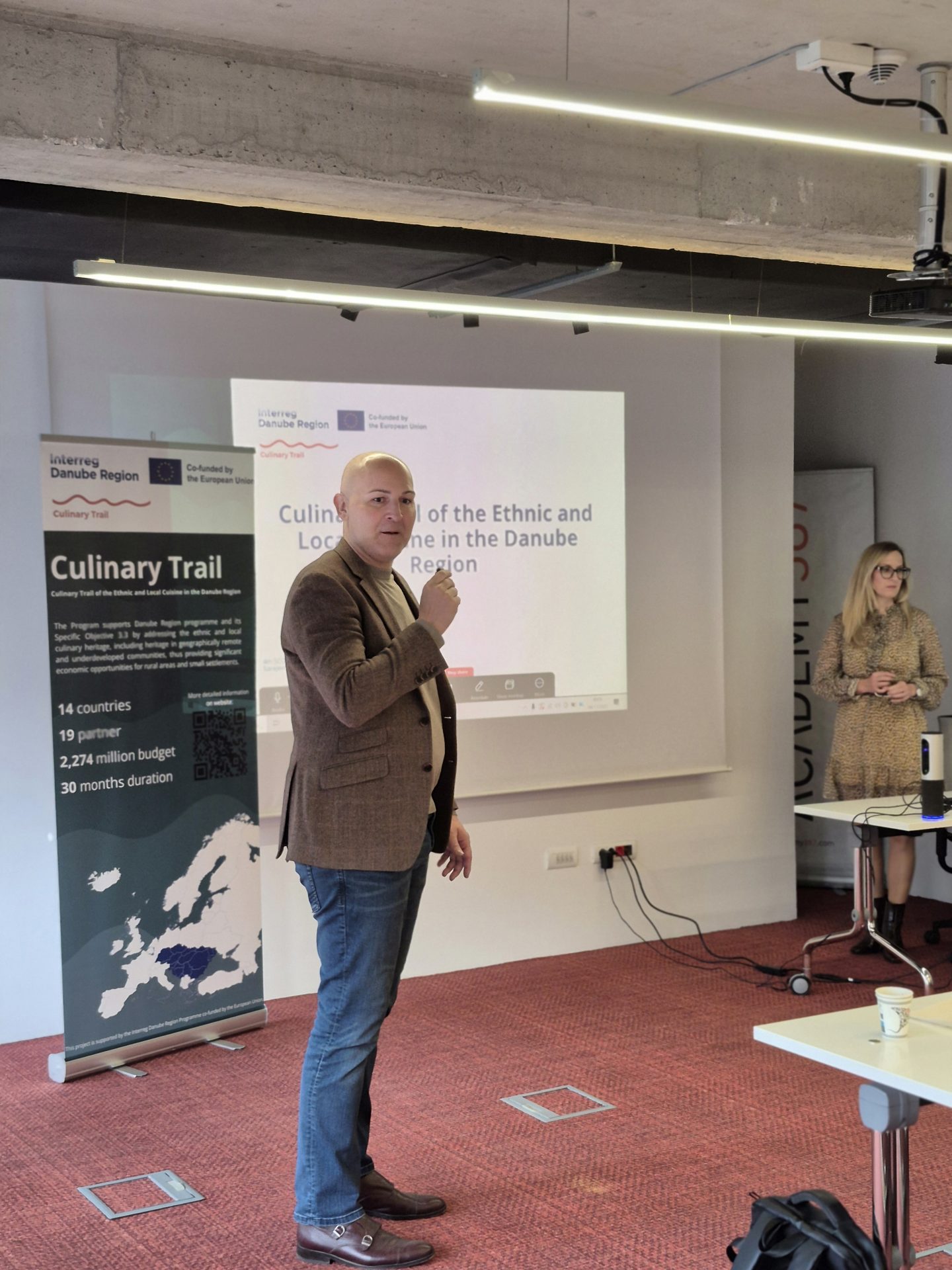 Pe parcursul celui de-al 14-lea Forum Anual EUSDR, Proiectul Culinary Trail a fost o prezență cheie în cadrul Ceremoniei Rețelei Centrelor de Transfer Dunărene din 4 noiembrie 2025, un eveniment dedicat inovării și transferului de cunoștințe. Proiectul Culinary Trail este recunoscut ca fiind unul dintre proiectele – pilot ale Ariei Prioritare 3 a Strategiei Dunării. Proiectul Culinary Trail este un exemplu inspirațional de integrare a patrimoniului culinar cu soluțiile digitale moderne. Obiectivul principal este de a transforma și promova moștenirea culinară a Regiunii Dunării într-un brand turistic durabil și incluziv. În cadrul evenimentului, Prof. Dr. Borut Rončević, Lider de proiect (SASS) a prezentat proiectul Culinary Trail Interreg Danube, evidențiind modul în care tehnologia digitală (VR) poate servi drept punte între tradiție și vizitatorii moderni. Participanții au avut posibilitatea de a fi parte a unei experiențe interactive și imersive a patrimoniului culinar local prin utilizarea ochelarilor VR. Culinary Trail a fost identificat ca fiind unul dintre proiectele inspiraționale alături de alte proiecte, dar și inițiative de finanțare, care ilustrează modul în care patrimoniul culinar poate fi valorificat prin parteneriate solide și contribuie direct la atingerea obiectivelor macro-regionale ale Regiunii Dunărea: