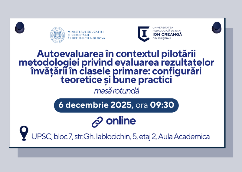 Universitatea Pedagogică de Stat „Ion Creangă” din Chișinău, Catedra Pedagogia Învățământului Primar, în parteneriat cu Ministerul Educației și Cercetării al Republicii Moldova, organizează masa rotundă „Autoevaluarea în contextul pilotării metodologiei privind evaluarea rezultatelor învățării în clasele primare: configurări teoretice și bune practici”.