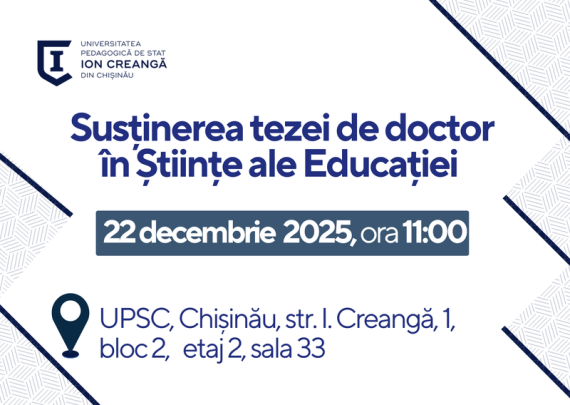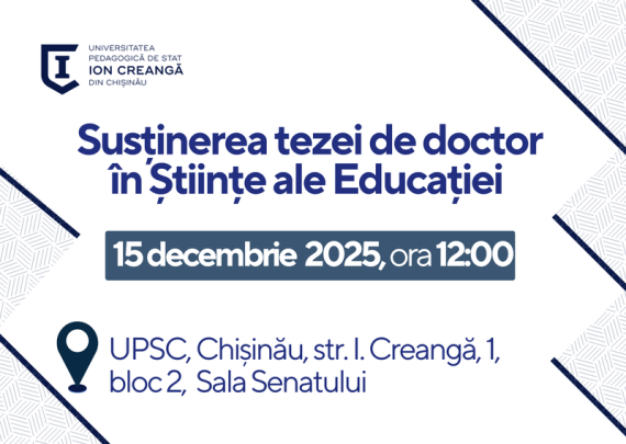 Candidat:AVRAM Alina Ionela Conducător științific: BULARGA Tatiana, dr., conf. univ. Tema tezei: DEZVOLTAREA INTERESULUI PENTRU ÎNVĂȚARE PRIN INTERDISCIPLINARITATE LA ELEVII CLASELOR PRIMARE Specialitatea: 532.02 Didactica școlară pe trepte și discipline de învățământ Data: 15.12.2025 Ora: 12.00 Locul: Universitatea Pedagogică de Stat „Ion Creangă” din Chișinău, str. Ion Creangă, 1, Sala […]