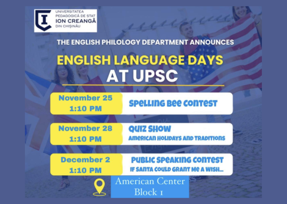 ZILELE LIMBII ENGLEZE la UPSC, ediția a 3-a Catedra de Filologie Engleză din cadrul Facultății de Limbi și Literaturi Străine vă invită să participați la evenimente speciale dedicate limbii și culturii engleze. Programul evenimentelor: Vino să îți testezi cunoștințele, să te distrezi și să te bucuri de o atmosferă prietenoasă […]