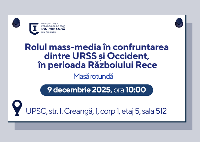 Vă invităm la Masa rotundă „Rolul mass-media în confruntarea dintre URSS și Occident în perioada Războiului Rece”, care va avea loc în incinta Facultății de Filologie și Istorie a UPS „Ion Creangă” din Chișinău pe data de 9 decembrie 2025, începând cu orele 10:00.