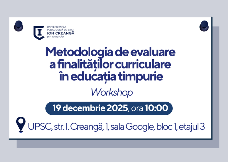 Vineri, 19 decembrie 2025, ora 10:00, str. Ion Creangă, 1 sala Google, Bloc 1, etajul 3, va avea loc workshopul „Metodologia de evaluare a finalităților curriculare în educația timpurie”, din cadrul subprogramului de cercetare 040104 „Monitorizarea implementării curricula pentru educația timpurie și învățământul primar”.