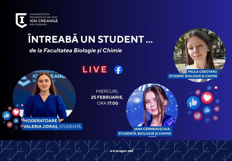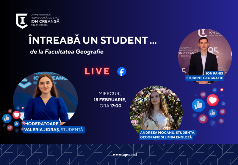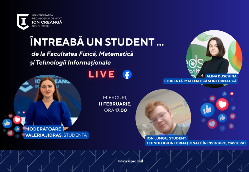 Universitatea Pedagogică de Stat „Ion Creangă” din Chișinău lansează campania de live-uri „Întreabă un student”, o inițiativă menită să aducă publicul mai aproape de viața studențească reală și de experiențele autentice ale celor care studiază la UPSC. Live-urile vor avea loc în fiecare miercuri, la ora 17:00, pe pagina oficială de Facebook a universității.