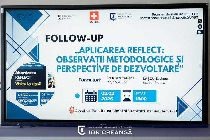 În data de 2 februarie 2026, în cadrul Proiectului „REFLECT Faza II – Învățare de calitate prin sistemul de la egal-la-egal din Moldova”, a avut loc atelierul de follow-up cu genericul „Aplicarea REFLECT: observații metodologice și perspective de dezvoltare”, desfășurat la Facultatea de Limbi și Literaturi Străine, sala 603.