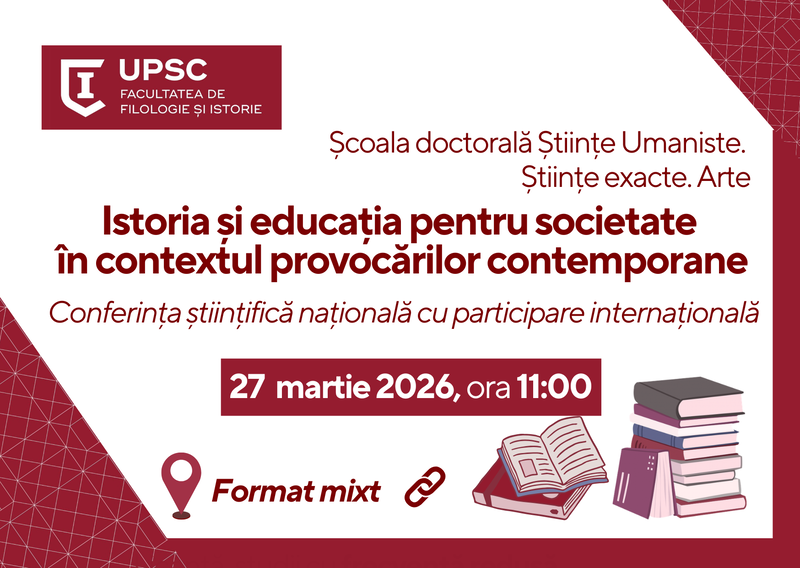 Universitatea Pedagogică de Stat „Ion Creangă” din Chișinău, Facultatea de Filologie și Istorie, Catedra Istorie și Științe Sociale, Școala doctorală „Științe Umaniste. Științe exacte. Arte”, Subprogramul „Abordarea problemelor controversate ale trecutului șiprezentului la disciplinele școlare Educațiepentru societate și Istorie” organizează Conferința științifică națională cu participare internațională „Istoria și educația pentru societate în contextul provocărilor contemporane”, care va avea loc la 27 martie 2026, str. Ion Creangă, 1, în regim mixt.