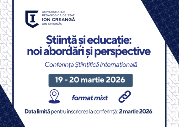 Universitatea Pedagogică de Stat „Ion Creangă” din Chișinău organizează Conferința Științifică Internațională „Știință și educație: noi abordări și perspective”, care va avea loc pe 19-20 martie 2026, în regim mixt. La evenimentul științific consacrat problemelor actuale, realizărilor și perspectivelor de dezvoltare în cadrul științelor sociale, umanistice, exacte, al științelor naturii […]