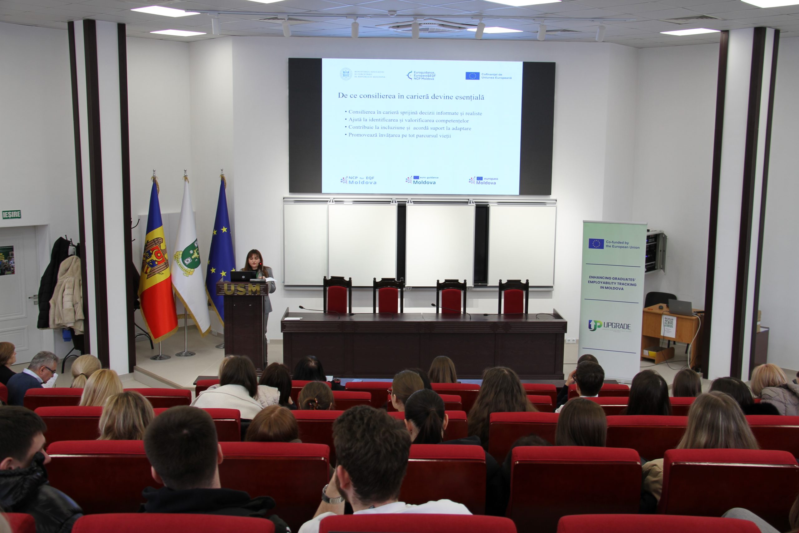Reprezentanții universităților partenere au prezentat studii de caz și bune practici privind dezvoltarea serviciilor de orientare în carieră, iar ziua s-a încheiat cu formularea concluziilor și stabilirea direcțiilor de acțiune pentru etapa următoare a workshop-ului. Cea de-a doua zi de workshop a continuat cu un târg de cariere, organizat de către Centrul de ghidare în carieră și relații cu piața muncii, USM, cu intervenții ale angajatorilor, dedicate absolventilor , dar și ateliere ale membrilor proiectului UPGRADE cu privire la importanța dialogului angajatori – studenți – profesori asupra noilor provocări generate de diversificarea metodelor de formare profesională.