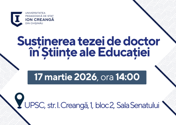 Candidat:TOPCU Iskender Conducător științific: BUDNIC Ana, dr., conf. univ. Tema tezei: Limba rusă: Педагогические условия формирования коммуникативной компетенции учащихся путём создания игровых ситуаций на занятиях английского языка Limba română: Condiţii pedagogice de formare a competenţei comunicative la elevi prin activităţi ludice în predarea limbii engleze; Limba engleză: Pedagogical conditions for […]
