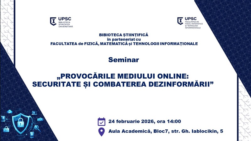 Biblioteca Științifică a Universității Pedagogice de Stat „Ion Creangă” din Chișinău, în parteneriat cu Facultatea de Fizică, Matematică și Tehnologii Informaționale, organizează seminarul „Provocările mediului online: securitate și combaterea dezinformării”, care va avea loc la data de 24 februarie 2026, în blocul 7, Aula Academică, la ora 14.00.