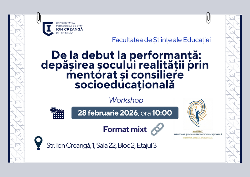 Facultatea de Științe ale Educației anunță desfășurarea unei sesiuni de reflecție și analiză aplicativă, organizată în cadrul Programului de master „Mentorat și consiliere socioeducațională”. Workshopul poartă genericul:„De la debut la performanță: depășirea șocului realității prin mentorat și consiliere socioeducațională”
