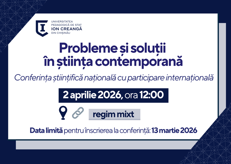 Universitatea Pedagogică de Stat „Ion Creangă” din Chișinău organizează Conferința științifică națională cu participare internațională „Problemeși soluții în știința contemporană” în data de 2 aprilie 2026, ora 12.00, în regim mixt.