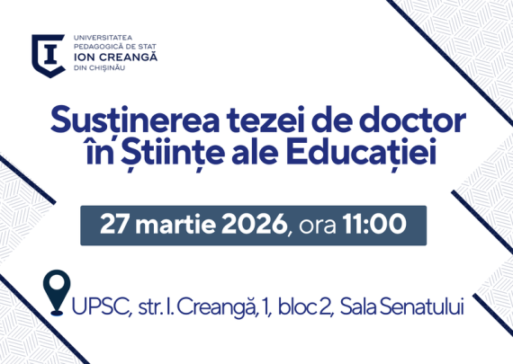 Candidat: CRIȘAN Elena Conducător științific: STRATAN Valentina, dr., conf. univ. Tema tezei: UTILITATEA SOFT-URILOR EDUCAȚIONALE ÎN CORECTAREA TULBURĂRILOR DE LIMBAJ LA ELEVII CU DIZABILITĂȚI DE INTELECT Specialitatea: 534.01 Pedagogie specială Data: 27.03.2026 Ora: 11.00 Locul: Universitatea Pedagogică de Stat „Ion Creangă” din Chișinău, str. Ion Creangă, 1, bloc 2, Sala Senatului. […]