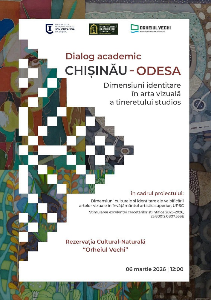 Facultatea Arte Vizuale și Design a Universității Pedagogice de Stat „Ion Creangă” din Chișinău, împreună cu Universitatea Națională Pedagogică de Sud „K.D. Ushynsky” din Odesa, Ucraina și Rezervația Cultural-Naturală „Orheiul Vechi”, vă invită să participați la un dialog academic dedicat dimensiunilor culturale și identitare în arta vizuală a tineretului studios. Evenimentul face parte din proiectul „Dimensiuni culturale și identitare ale valorificării artelor vizuale în învățământul artistic superior”, susținut în cadrul programului Stimularea excelenței cercetărilor științifice 2025–2026.