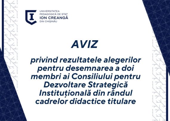 Comisia Electorală Universitară informează că, în data de 09 martie 2026, au fost organizate și desfășurate alegerile pentru desemnarea a doi membri ai Consiliului pentru Dezvoltare Strategică Instituțională (CDSI) din rândul cadrelor didactice titulare ale I.P. Universitatea Pedagogică de Stat „Ion Creangă” din Chișinău. Scrutinul a avut loc în Aula […]