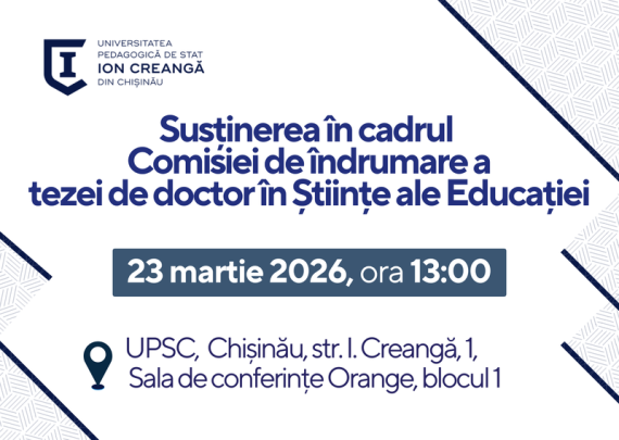 Candidat: CIOBÎCĂ Paula Tamara Conducător științific: MARIN Mariana, dr. conf. univ. Tema tezei: RECEPTAREA TEXTELOR LITERARE DE CĂTRE LICEENI ÎN CONTEXTUL TEHNOLOGIILOR DE ÎNVĂȚARE VIZIBILĂ Specialitatea științifică: 532.02 Didactica școlară pe trepte și discipline de învățământ Data: 27.03.2026 Ora: 13:00 Locul: Universitatea Pedagogică de Stat „Ion Creangă” din Chișinău, Sala […]