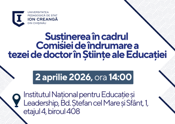 Candidat: SEMENIUC Natalia Conducător științific: ANDRIȚCHI Viorica, dr. hab., prof. univ. Tema tezei: CONTEXTUALIZAREA PARTICIPĂRII COPILULUI ÎN PROCESELE DECIZIONALE DEMOCRATICE ÎN ÎNVĂȚĂMÂNTUL GENERAL Specialitatea științifică: 531.01 Teoria generală a educației Data: 02.04.2026 Ora: 14:00 Locul: Institutul Național pentru Educație și Leadership, Bd. Ștefan cel Mare și Sfânt, 1, etajul 4, […]
