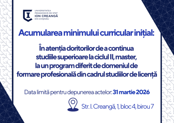 ÎN ATENȚIA PERSOANELOR CARE DORESC SĂ CONTINUE STUDIILE SUPERIOARE LA CICLUL II – MASTER, LA UN PROGRAM DIFERIT DE DOMENIUL DE FORMARE PROFESIONALĂ DIN CADRUL STUDIILOR DE LICENȚĂ AVIZ Universitatea Pedagogică de Stat „Ion Creangă” din Chișinău anunță înscrierea candidaților pentru acumularea minimului curricular inițial, în vederea continuării studiilor superioare […]