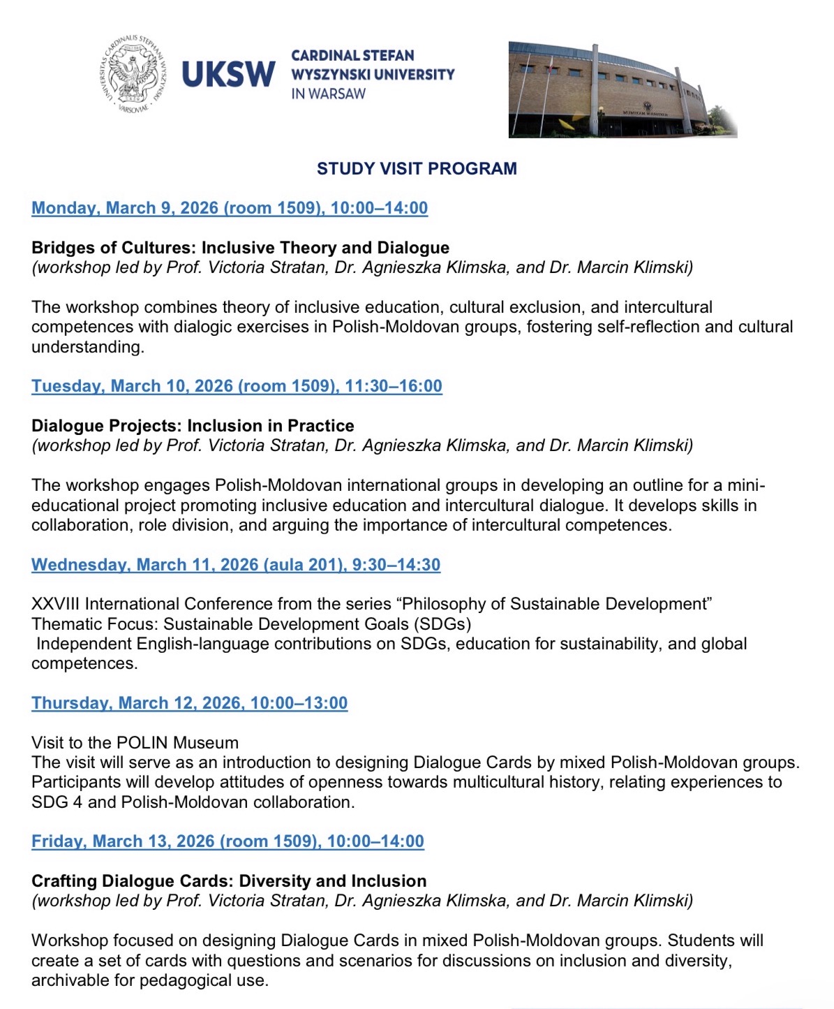 Mobilitatea a fost inițiată și coordonată de conf. univ. dr. Victoria Stratan, din partea Universității Pedagogice de Stat „Ion Creangă”, și dr. Agnieszka Klimska, de la Cardinal Stefan Wyszyński University din Varșovia.