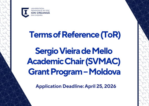 Termeni de Referință (ToR). Programul de Granturi al Catedrei Academice Sergio Vieira de Mello (SVMAC) – Moldova Data emiterii: 2 martie 2026 Termen limită pentru depunerea cererilor: 25 aprilie 2026 1. Introducere și context 1.1. Scopul acestui document este de a stabili Termenii de Referință pentru Programul de Granturi al […]