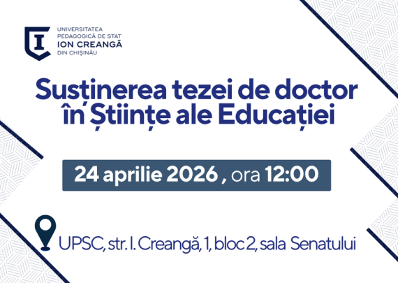 Candidat: TIMUȚA Aliona Conducător științific: BRIGALDA Eleonora, dr., prof. univ. Tema tezei: EFICIENTIZAREA INSTRUIRII STUDENŢILOR-GRAFICIENI PRIN INTERMEDIUL STUDIERII SPECIFICULUI GRAFICII DE CARTE Specialitatea: 532.02 Didactica școlară pe trepte și discipline de învățământ Data: 24.04.2026 Ora: 12.00 Locul: Universitatea Pedagogică de Stat „Ion Creangă” din Chișinău, blocul de studii nr. 2, Sala […]