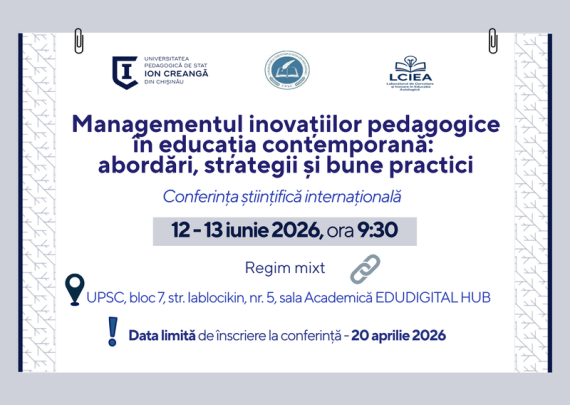 Universitatea Pedagogică de Stat „Ion Creangă” din Chișinău, Laboratorul „Cercetări şi inovaţii pedagogice”, Laboratorul „Cercetare şi inovare în educația axiologică” organizează Conferința științifică internațională„ Managementul inovațiilor pedagogice în educația contemporană:abordări, strategii și bune practici”. Evenimentul se va desfășura în 12 -13 iunie 2026, ora 9.30, str. Iablocikin 5, sala Academică […]