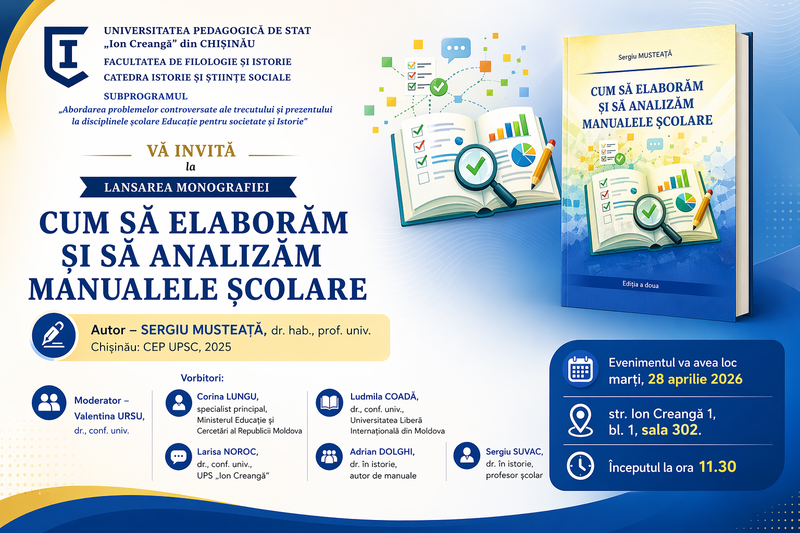 Universitatea Pedagogică de Stat „Ion Creangă” din Chișinău, FACULTATEA DE FILOLOGIE ȘI ISTORIE, Catedra Istorie și Științe Sociale vă invită evenimentul de lansare a monografiei: CUM SĂ ELABORĂM ȘI SĂ ANALIZĂM MANUALELE ȘCOLARE, autor – SERGIU MUSTEAȚĂ, dr. hab., prof. univ.