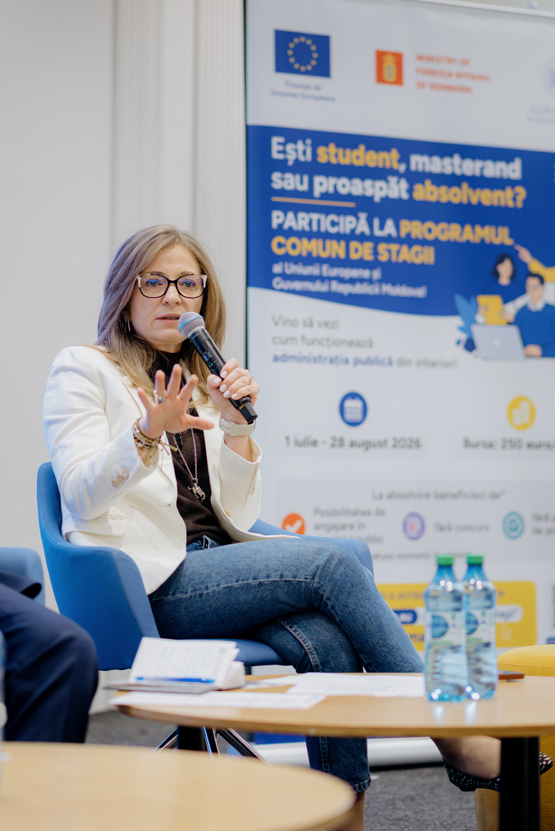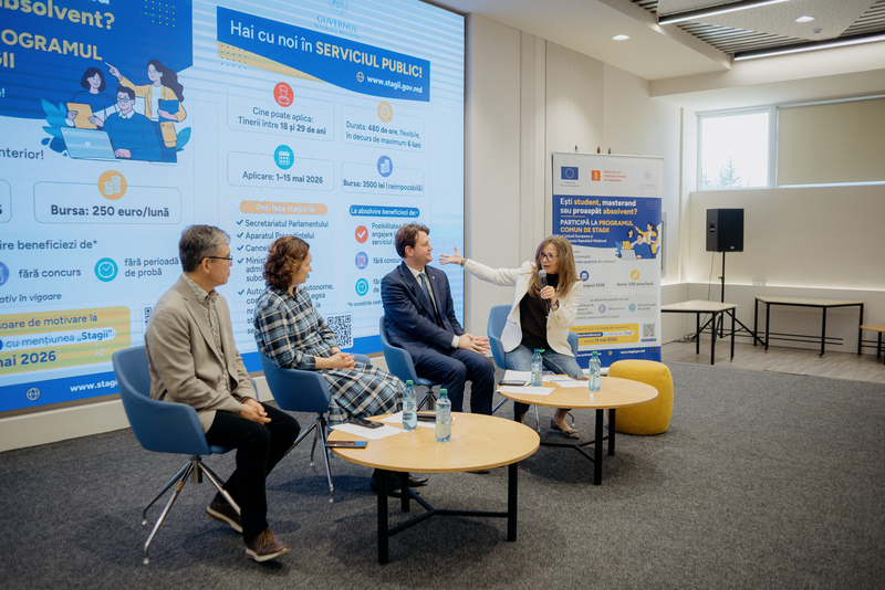 Unele dintre cele mai convingătoare povești au venit însă de la cei care au parcurs deja acest drum: Crina Stegărescu, fostă stagiară și în prezent angajată a Ministerului Culturii, și Maria Golubaș, fostă stagiară care lucrează acum la Centrul de Armonizare a Legislației, au vorbit despre modul în care stagiul le-a deschis oportunități — și de ce au ales să rămână și să-și construiască o carieră în administrația publică din Moldova.