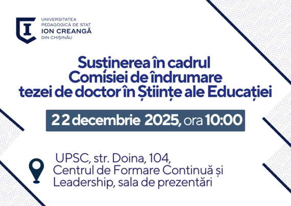 Candidat: CIOBANU Claudia-Veronica Conducător științific: MARIN Mariana, dr., conf. univ. Tema tezei: LUDIC ȘI ESTETIC ÎN FORMAREA LA ELEVII CLASELOR PRIMARE A CULTURII ARTISTIC-ESTETICE Specialitatea științifică: 532.02 Didactica școlară pe trepte și discipline de învățământ Data: 22 decembrie 2025 Ora: 10:00 Locul: UPSC, str. Doina, nr. 104, Centrul de Formare […]