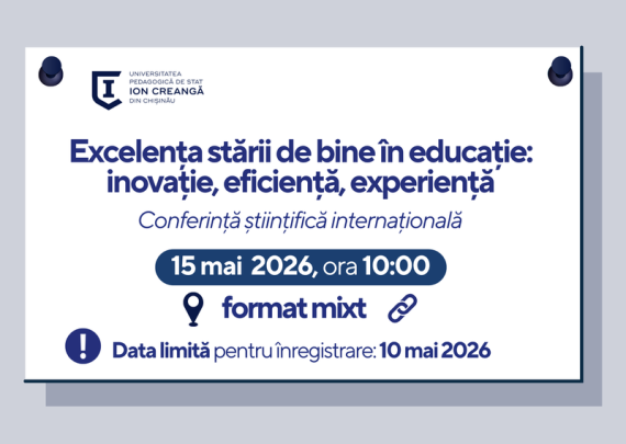 Universitatea Pedagogică de Stat „Ion Creangă” din Chișinău, Subprogramul de cercetare „Mecanisme psihologice de promovare a stării de bine în sistemul educațional” (cod: 040112) organizează Conferința științifică internațională Excelența stării de bine în educație: inovație, eficiență, experiență care va avea loc pe 15 mai 2026, ora 10:00 în regim mixt […]