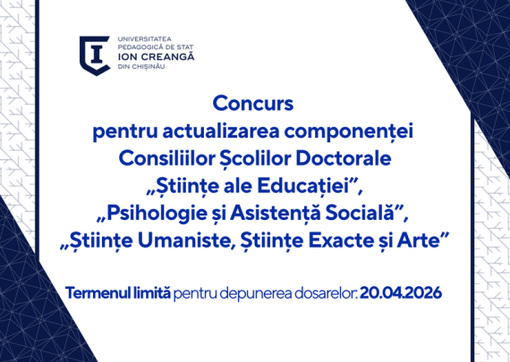 Consiliul Științific al Universității Pedagogice de Stat „Ion Creangă” din Chișinău lansează procedura de depunere a dosarelor pentru concursul de actualizare a componenței Consiliilor Școlilor Doctorale „Științe ale Educației”, „Psihologie și Asistență Socială”, „Științe Umaniste, Științe Exacte și Arte”. Se propun pentru alegere: Condiții de participare la concurs: Dosarul candidatului va […]