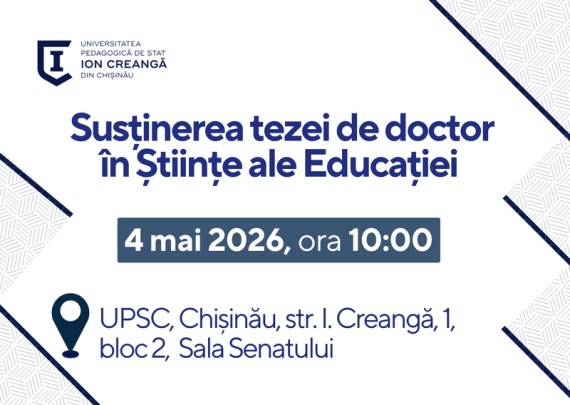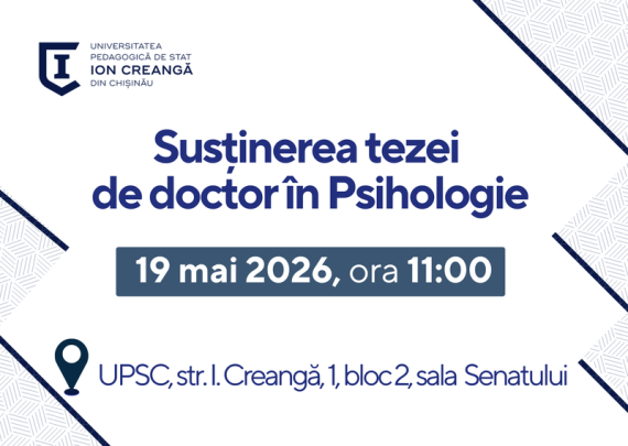 Candidat: GOLOVEI Lilia Conducător științific: CUCER Angela, dr., conf.univ. Tema tezei: IMPACTUL RESURSELOR PERSONALE ASUPRA ORIENTĂRII PROFESIONALE ALE PERSOANELOR CU DIZABILITĂȚI Specialitatea științifică: 511.06 Psihologie specială Data: 22 aprilie 2026 Ora: 11:00 Locul: Universitatea Pedagogică de Stat „Ion Creangă” din Chișinău, blocul 2; etajul 3, sala 25, str. I. Creangă, […]