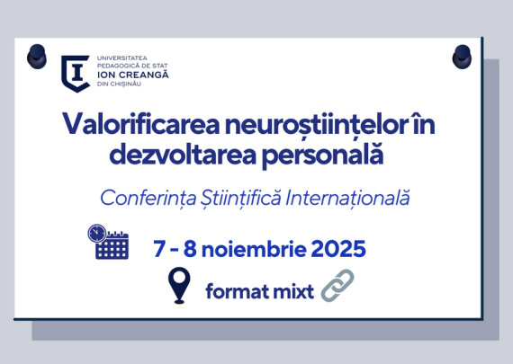 Universitatea Pedagogică de Stat „Ion Creangă” din Chișinău, subprogramul instituțional de cercetare „Modele de valorificare a neuroștiințelor în dezvoltarea personală”, organizează Conferința Științifică Internațională „Valorificarea neuroștiințelor în dezvoltarea personală”. Evenimentul va avea loc pe 7 – 8 noiembrie 2025, în format mixt. La evenimentul științific sunt invitate cadre științifico-didactice, didactice […]