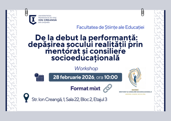Facultatea de Științe ale Educației anunță desfășurarea unei sesiuni de reflecție și analiză aplicativă, organizată în cadrul Programului de master „Mentorat și consiliere socioeducațională”. Workshopul poartă genericul:„De la debut la performanță: depășirea șocului realității prin mentorat și consiliere socioeducațională” Evenimentul își propune valorizarea bunelor practici de mentorat și consiliere socioeducațională, […]