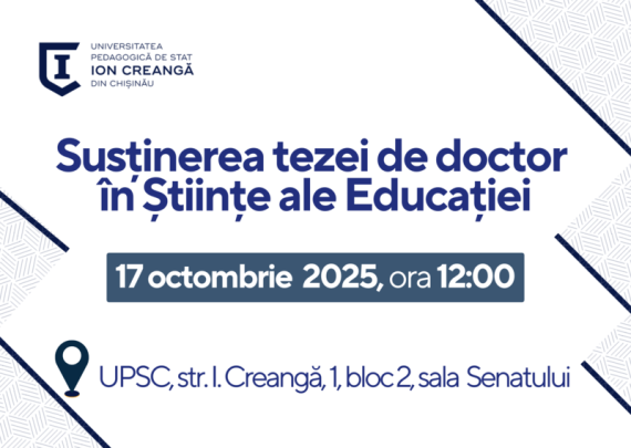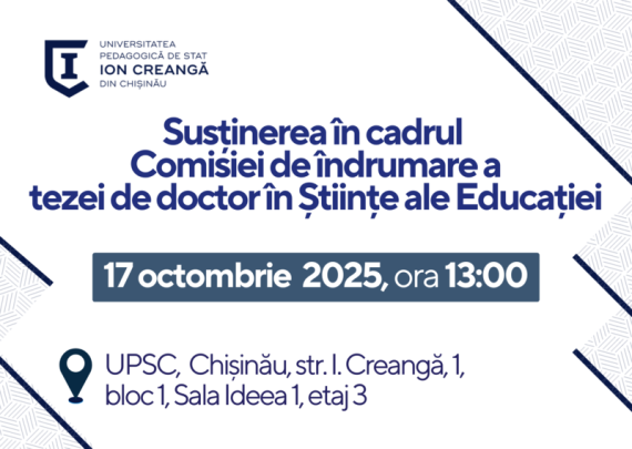 Candidat: PĂTRAȘCU Alexandra Conducător științific: BOCANCEA Viorel, doctor, conferențiar universitar Tema tezei: „FORMAREA COMPETENȚELOR SPECIFICE GEOGRAFIEI PRIN ACTIVITĂȚI PRACTICE LA ELEVII LICEENI” Specialitatea: 532.02. Didactica școlară pe trepte și discipline de învățământ (Geografie) Data: 22.10.2025 Ora: 14.00 Locul: Universitatea Pedagogică de Stat „Ion Creangă” din Chișinău, str. Ion Creangă 1, […]