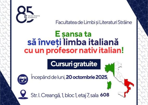 Facultatea de Limbi și Literaturi Străine, Universitatea Pedagogică de Stat „Ion Creangă”, organizează Cursul de Limbă și Cultură Italiană, deschis tuturor celor pasionați de limba și civilizația italiană. Cursurile au început luni, 20 octombrie 2025, și sunt coordonate de Lorella Frankarli, profesoară vorbitoare nativă din Italia, care îi va ghida pe participanți într-o călătorie fascinantă […]