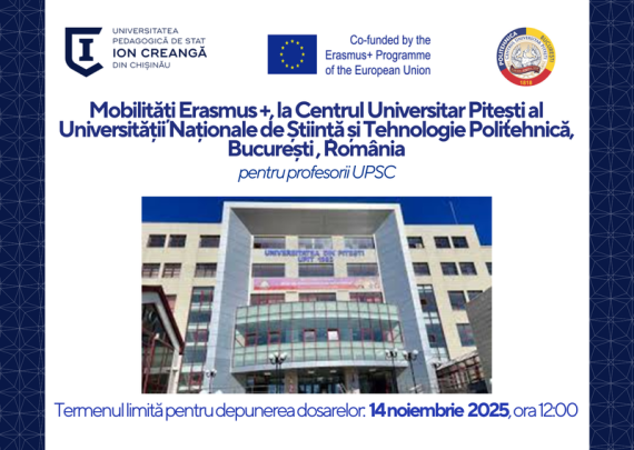 Secția de Relații Internaționale și Managementul Proiectelor a Universității Pedagogice de Stat „Ion Creangă” din Chișinău anunță concurs de depunere a dosarelor pentru2 (două) burse de predarepentru profesorii UPSC, la Centrul Universitar Pitești al Universității Naționale de Știință și Tehnologie Politehnica București. Termen limită de depunere a dosarelor de candidatură: 14 noiembrie, 2025, […]