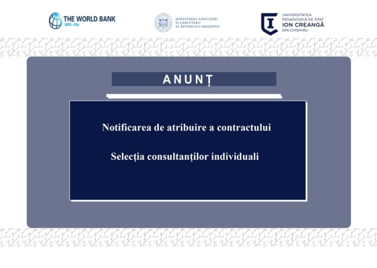 Notificarea privind atribuirea contractului Selecția consultanților individuali Contract nr. MD-PEDAGOGUNI-493550-CS-INDV „Consultanță în elaborarea curricula cursului universitar și a suportului didactic: […]